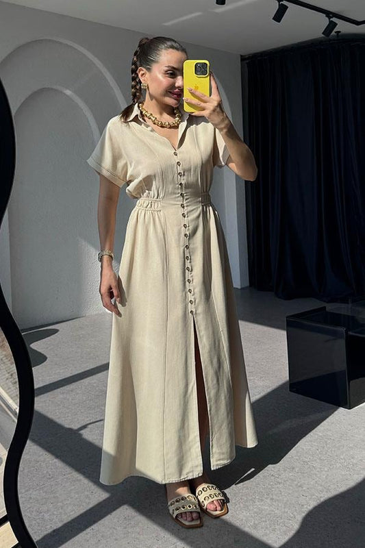 3 AL 2 ÖDEValerie Düğme Detaylı Yakalı Elbise-Krem