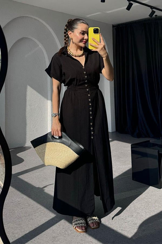 3 AL 2 ÖDEValerie Düğme Detaylı Yakalı Elbise-Siyah