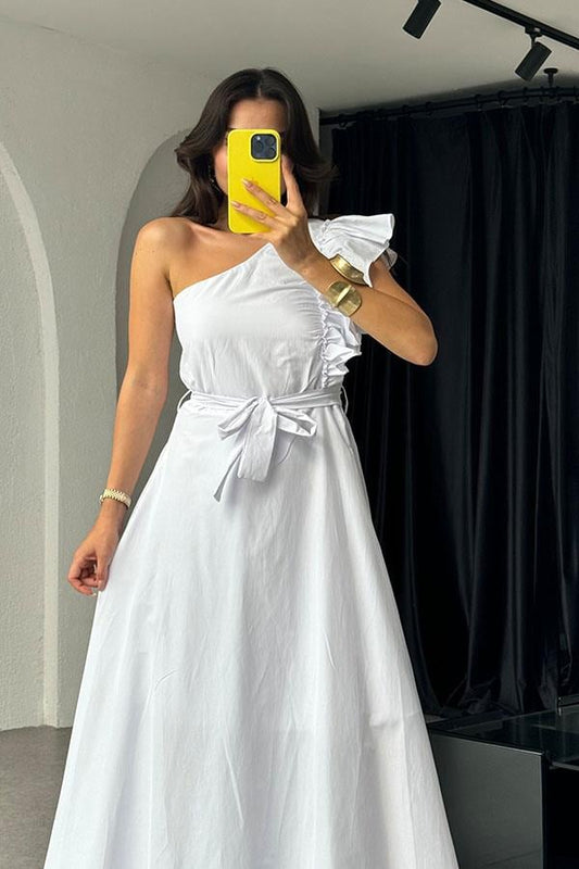 3 AL 2 ÖDEValeska Tek Omuz Kuşaklı Elbise- Beyaz