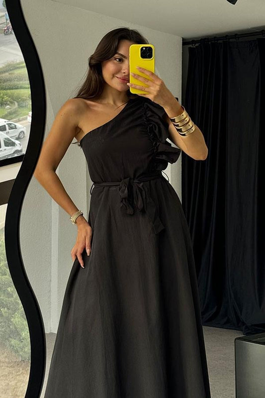 3 AL 2 ÖDEValeska Tek Omuz Kuşaklı Elbise- Siyah