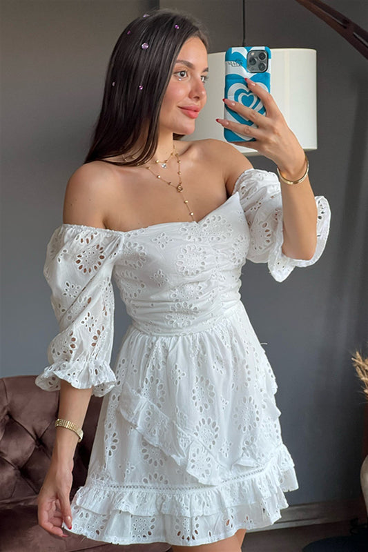 3 AL 2 ÖDEBEYAZ DANTEL DETAYLI MADONNA YAKA ELBISE