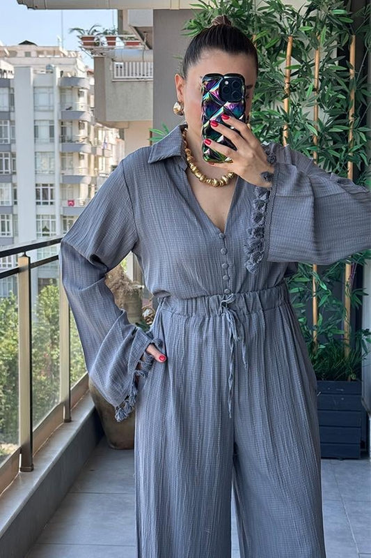 Viva Kolları Püsküllü Gömlek Pantolon Takım - FümeNormal fiyat 749.00TLİndirimli fiyat 749.00TL Normal fiyatBirim fiyat /1,350.00TL44%