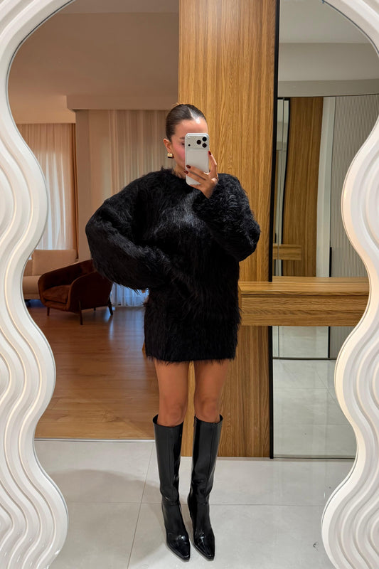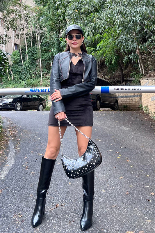 3 AL 2 ÖDEYakası fermuarlı siyah kadife elbise