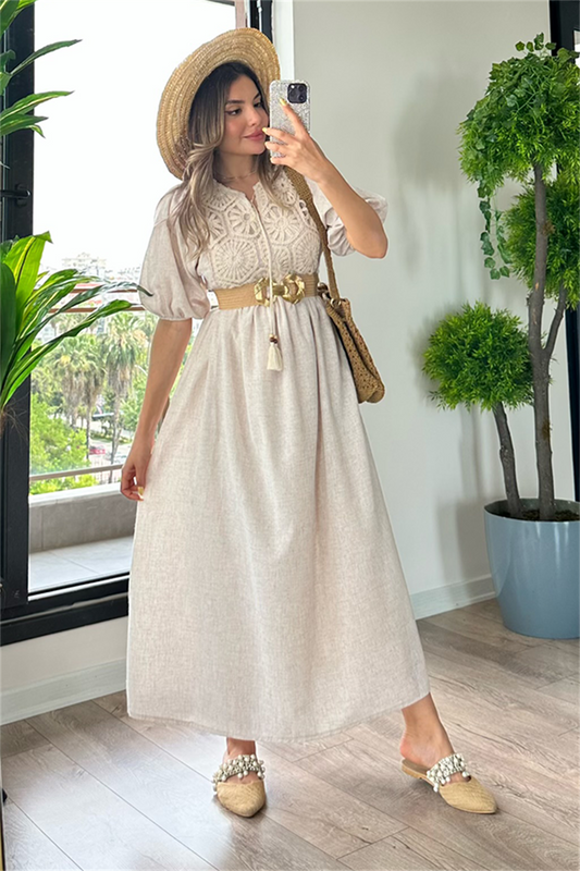 3 AL 2 ÖDEYakası dantel geçişli krem keten elbise