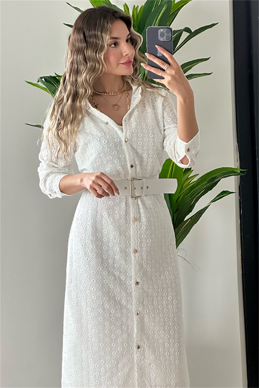 3 AL 2 ÖDEBeyaz önden full düğmeli güpürlü elbise