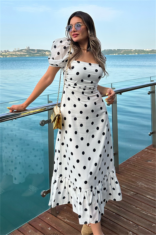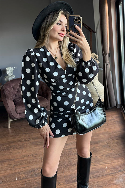3 AL 2 ÖDEBeyaz puantiyeli siyah balon kol elbise