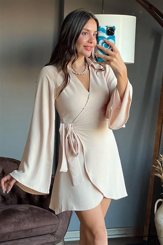 3 AL 2 ÖDEYarasa kol yandan bağlamalı ekru elbise