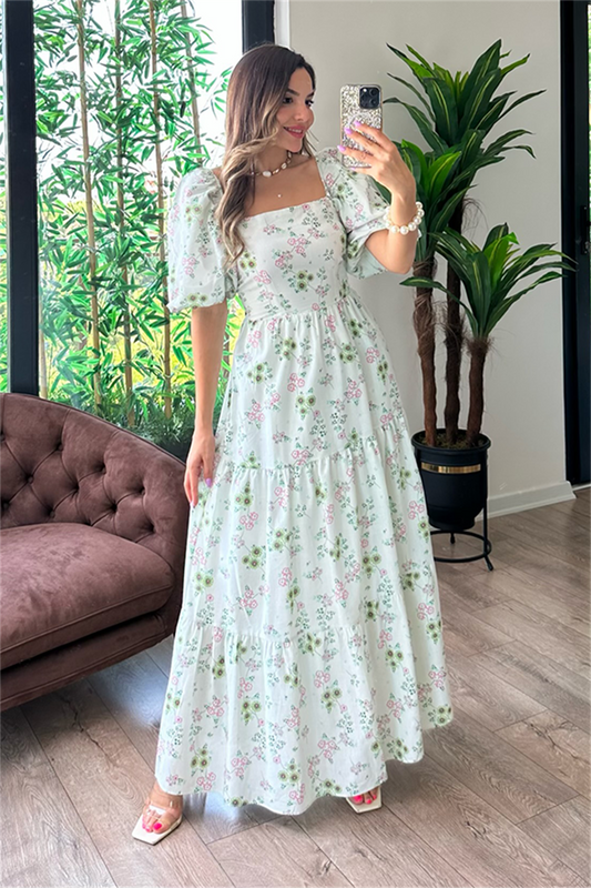 3 AL 2 ÖDEYeşil çiçekli beyaz balon kol elbise