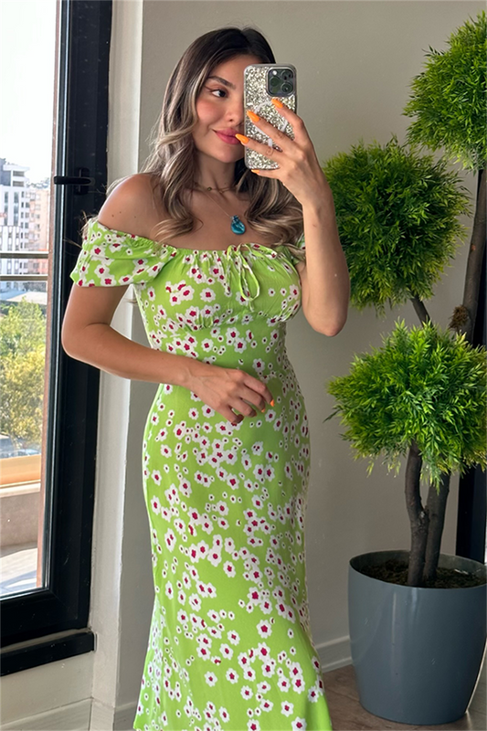 3 AL 2 ÖDEYeşil çiçekli madonna yaka elbise