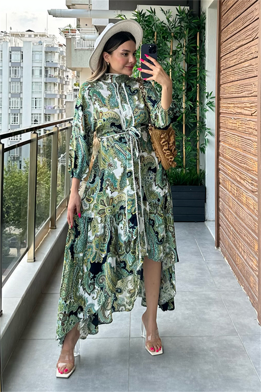 3 AL 2 ÖDEYeşil etnik desenli önü kısa tasarım elbise
