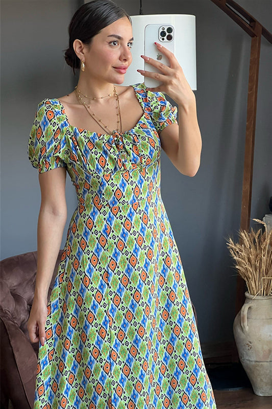 3 AL 2 ÖDEYeşil karpuz kol etnik desenli elbise