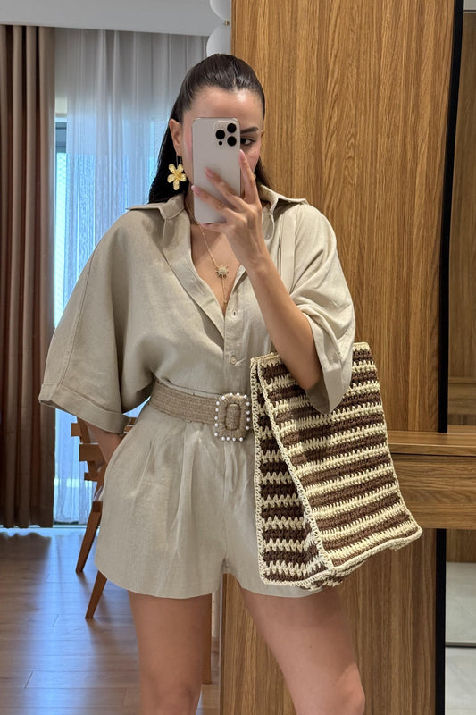 3 AL 2 ÖDEZavina Kahve Kemerli Ham Keten Takım