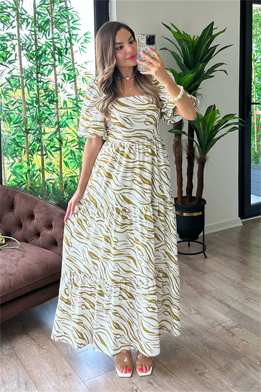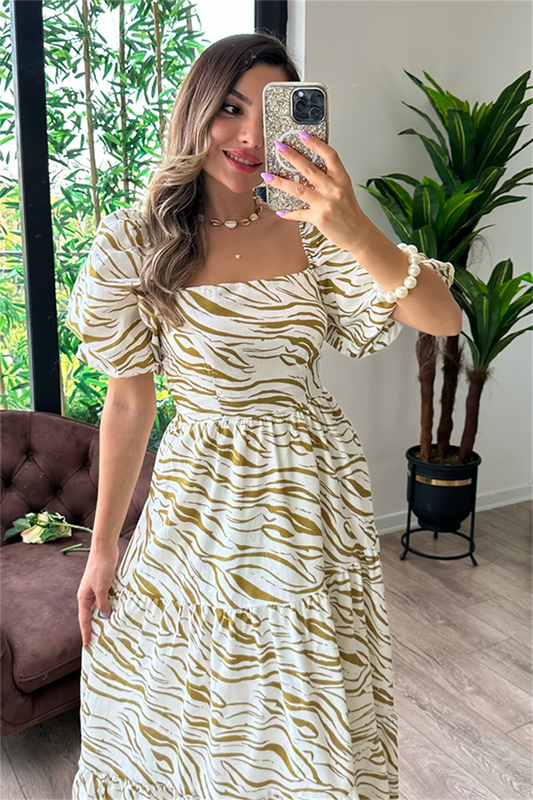 3 AL 2 ÖDEZebra desen yağ yeşili balon kol elbise