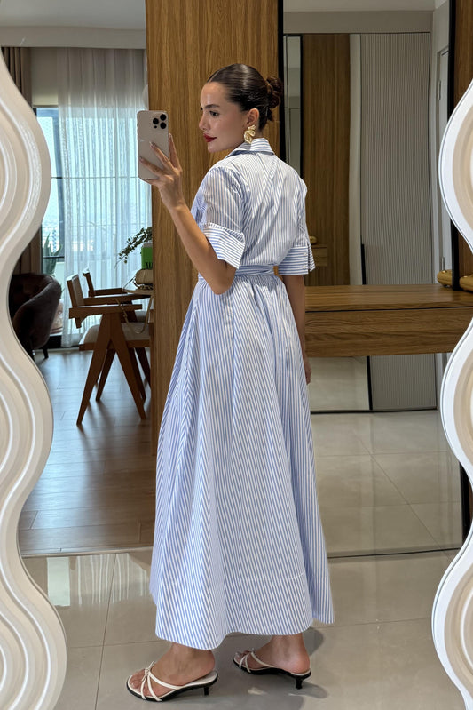 3 AL 2 ÖDEZelinda Mavi Çizgili Gömlek Yaka Uzun Elbise