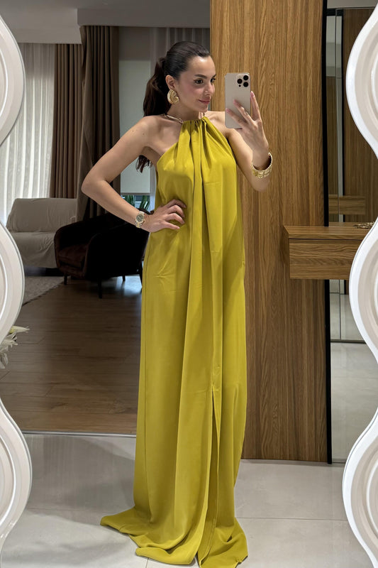 3 AL 2 ÖDEZylen Yağ Yeşili Boyundan Kolyeli Elbise