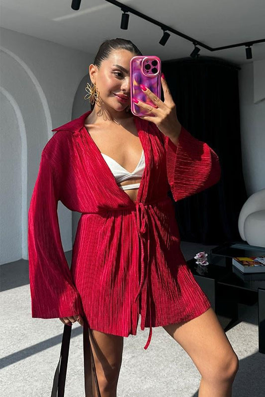 Adaline Kırinkıl Kimonolu Şortlu Takım-Kırmızı