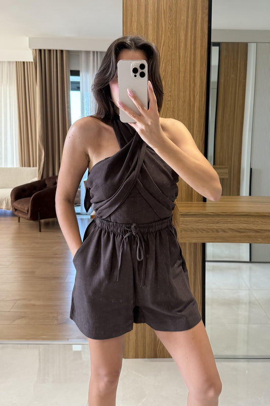 3 AL 2 ÖDEBlones Kahve Boyundan Bağlamalı Keten Takım