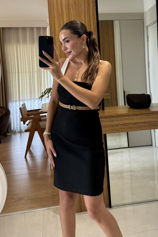 Cardi Siyah -Beyaz Renk Bloklu Vücuda Oturan Kemerli Elbise