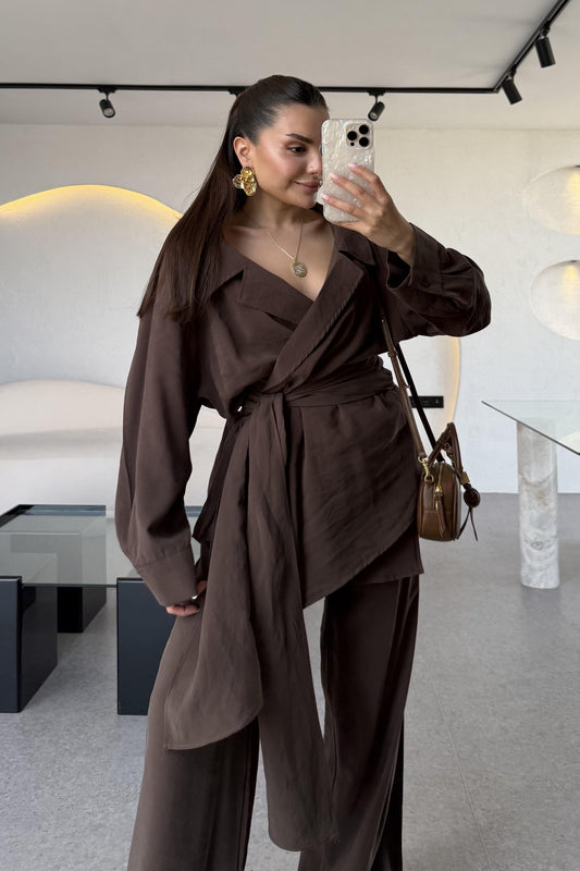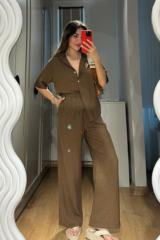 Casal Kısa Kol Gömlek Pantolon Takım - Acı Kahve