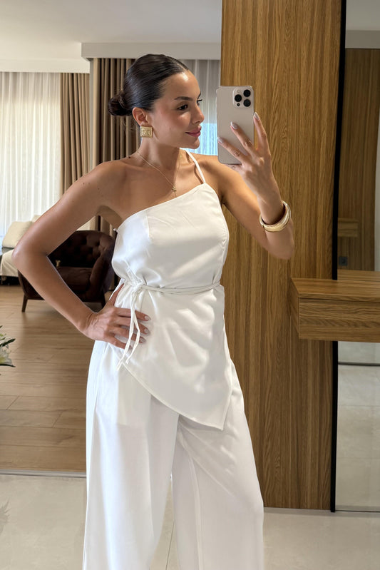 Casandra Beyaz Tek Omuz Askılı Straplez Bluz Takım