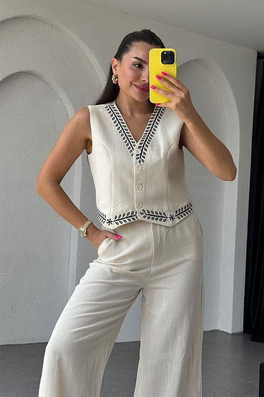 Ceille Nakış Detaylı Keten Pantolon Yelek Takım