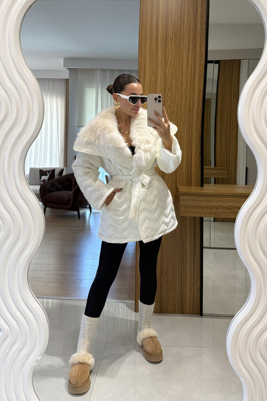 3 AL 2 ÖDEColmar Beyaz Kürklü Kemerli Şişme Mont