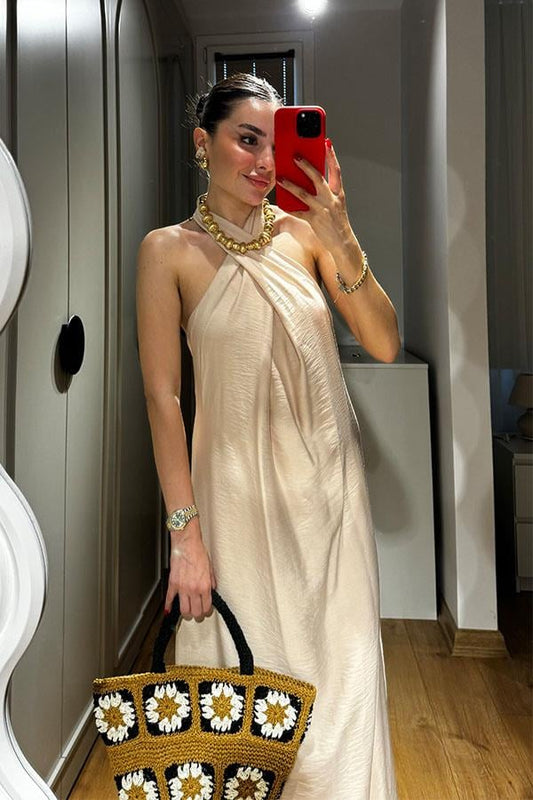 Esther Boyundan Bağlamalı Sırt Dekolteli elbise-Krem