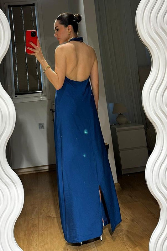 Esther Boyundan Bağlamalı Sırt Dekolteli elbise-Saks Mavi