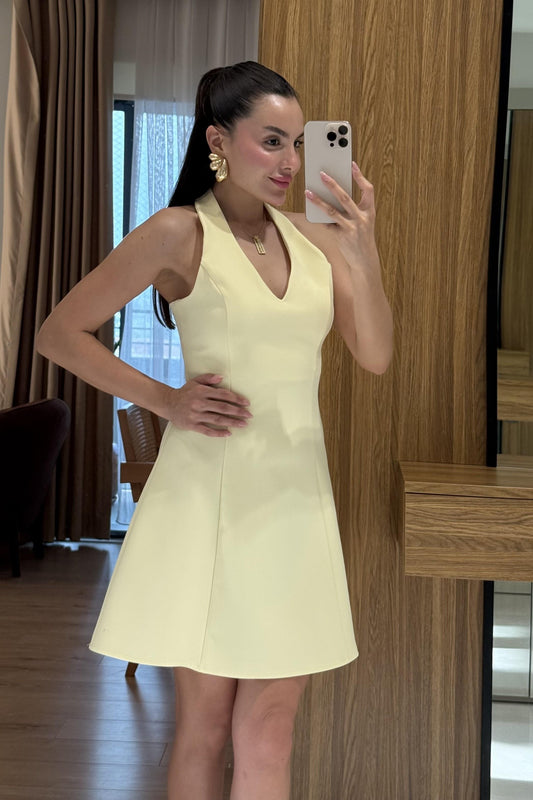 Farella Sarı V Yaka Boyundan Bağlamalı Elbise