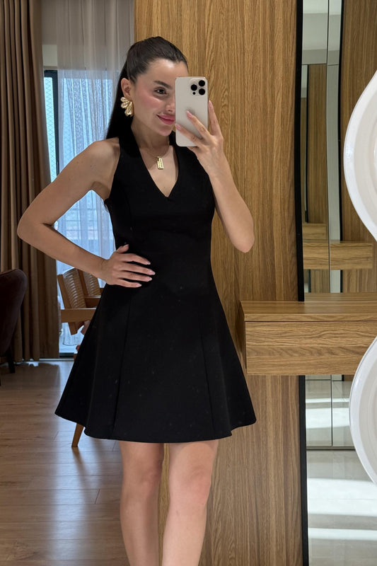 Farella Siyah V Yaka Boyundan Bağlamalı Elbise