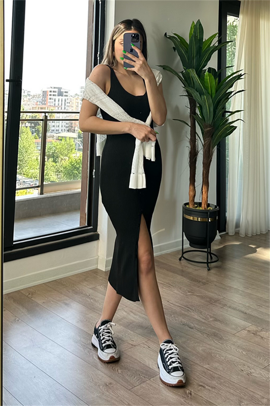 3 AL 2 ÖDEFitilli yırtmaçlı kalem triko elbise
