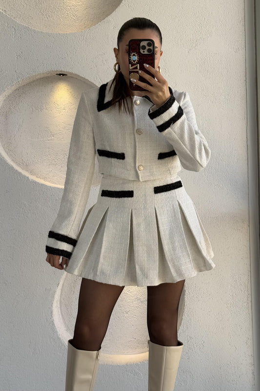 3 AL 2 ÖDEFlamengo Ekru Ceket Piliseli Mini Etek Takım