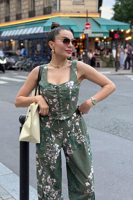 3 AL 2 ÖDEFlore Çiçek Desenli Balenli Takım-Yeşil