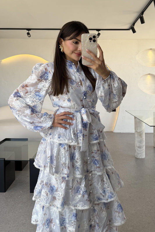 3 AL 2 ÖDEFloresta Mavi Çiçekli Tasarım Kat Kat Elbise
