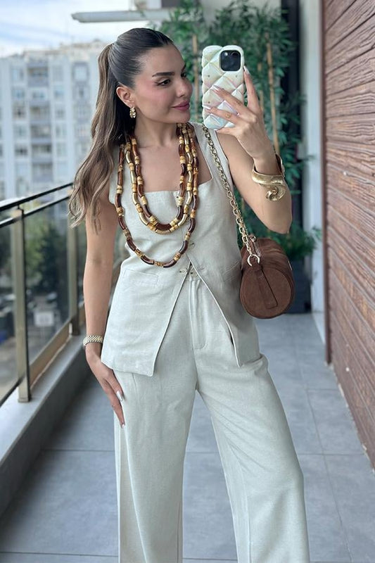 3 AL 2 ÖDEFranco Keten Kare Yaka Takım - Krem