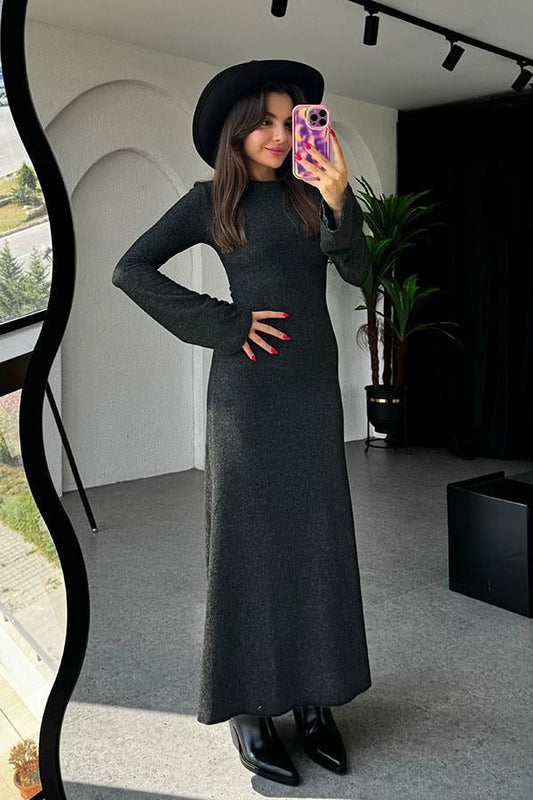3 AL 2 ÖDEFranny Bisiklet Yaka Dokulu Gri Elbise