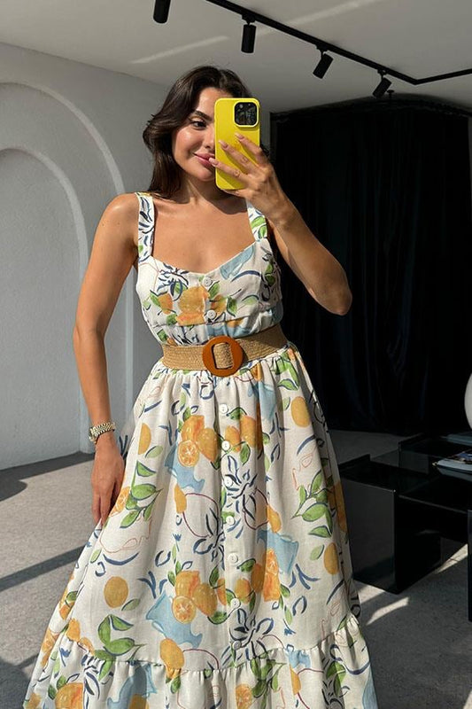 3 AL 2 ÖDEFruit Desenli Kalın Askılı Elbise