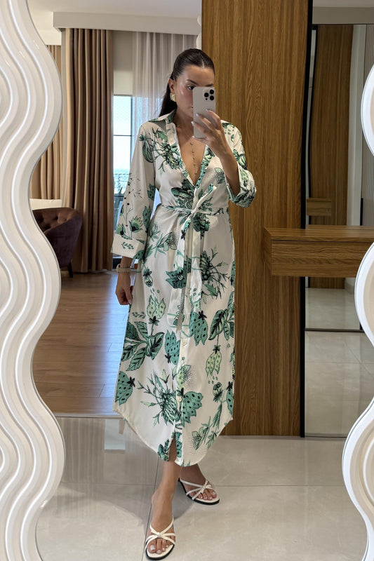 Furia Yeşil Çiçek Desenli Belden Bağlamalı Elbise