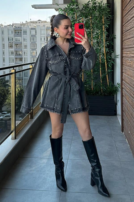 3 AL 2 ÖDEGabby Zımbalı Kot Elbise - Füme