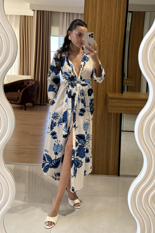 Furia Mavi Çiçek Desenli Belden Bağlamalı Elbise