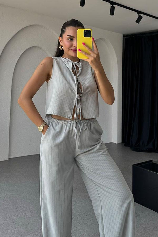 3 AL 2 ÖDEAliza Bağlamalı Çizgili Tensel Takım-Gri