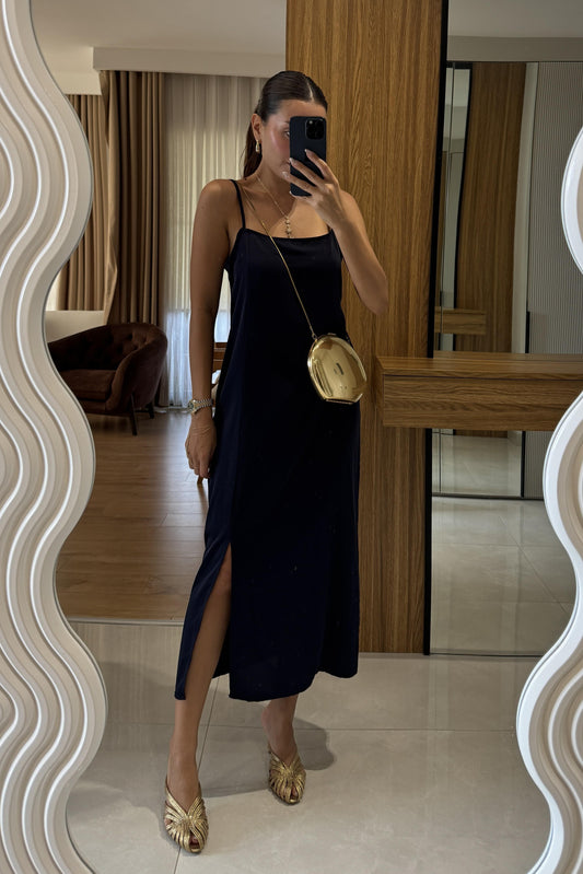 3 AL 2 ÖDEGown Lacivert Askılı Yırtmaçlı Elbise