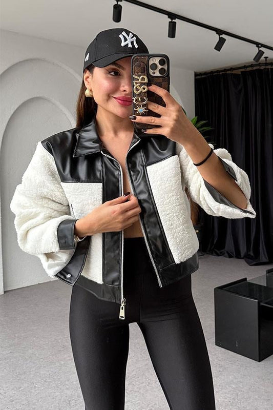 3 AL 2 ÖDEGrasso Teddy Siyah Deri Karışımlı Ceket