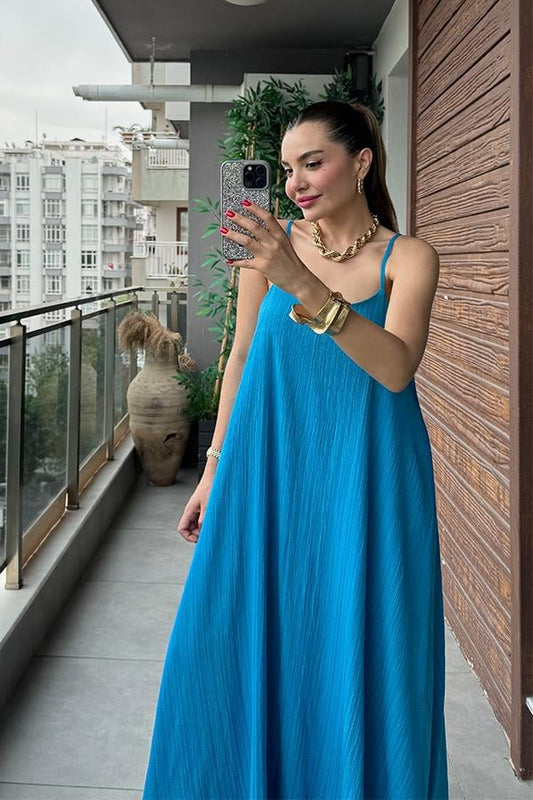 3 AL 2 ÖDEHaifa Keten Kırinkıl Askılı Elbise-Mavi