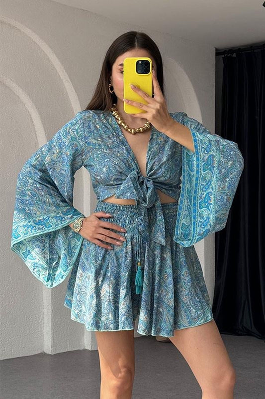 3 AL 2 ÖDEGypsy Etnik Desenli Şort Takım - Saks