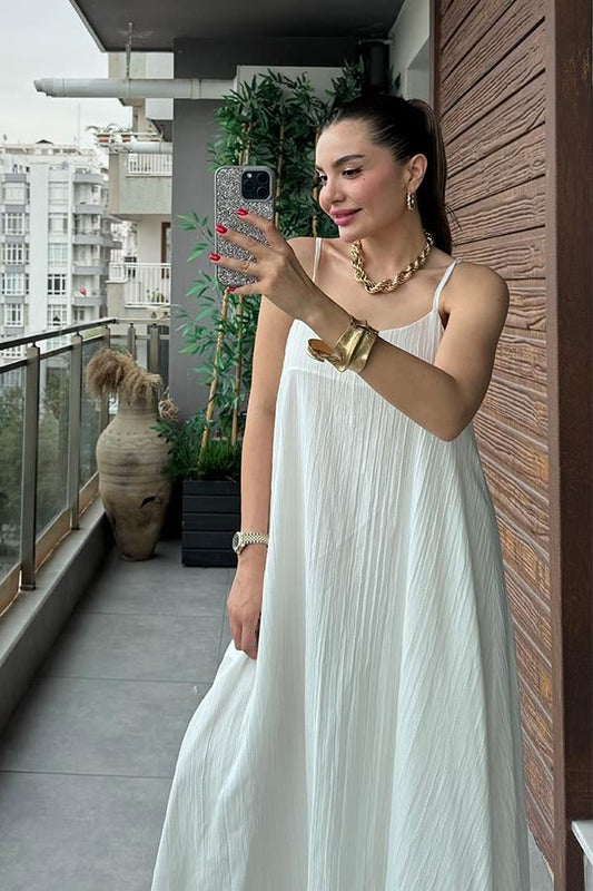 3 AL 2 ÖDEHaifa Keten Kırinkıl Askılı Elbise-Beyaz