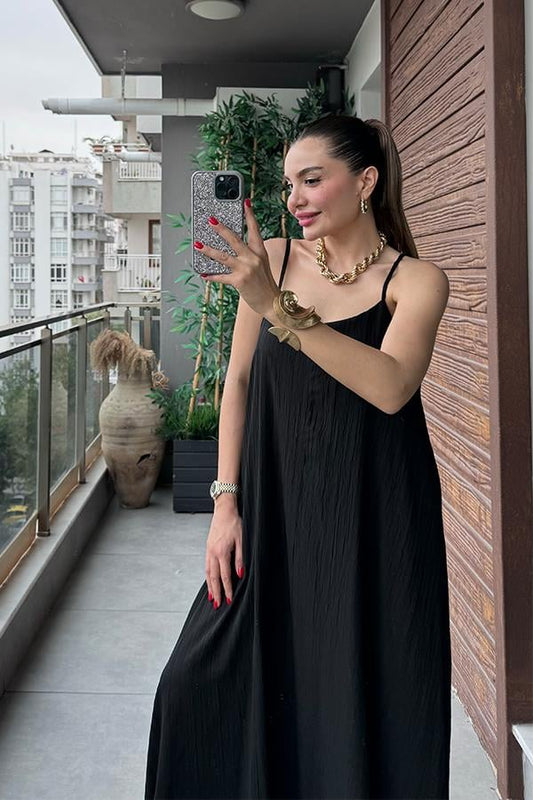 3 AL 2 ÖDEHaifa Keten Kırinkıl Askılı Elbise-Sİyah