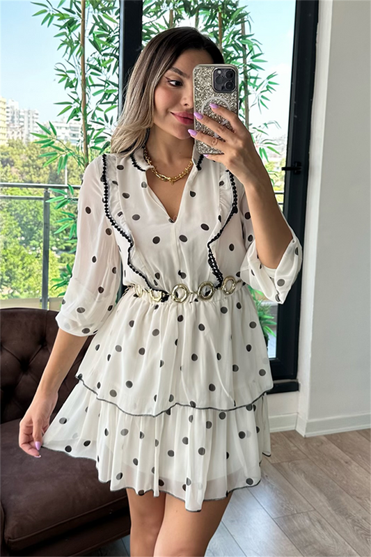 3 AL 2 ÖDEAmanda beyaz puantiyeli kat kat şifon elbise