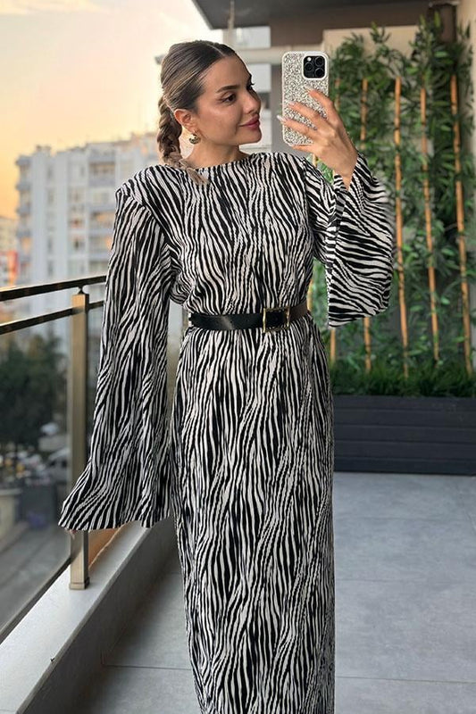3 AL 2 ÖDEAmata Siyah Beyaz Desenli Kemerli Elbise