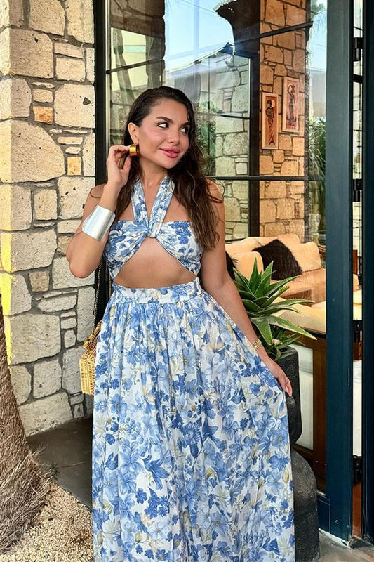 3 AL 2 ÖDEAmella Mavi Çiçekli Etekli Crop Takım